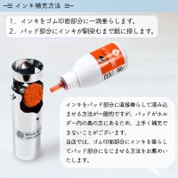 ※ お勧めのインキ補充方法 ※ 1.インキをゴム印面部分に一滴垂らします 2.パッド部分にインキが馴染むまで紙に捺します